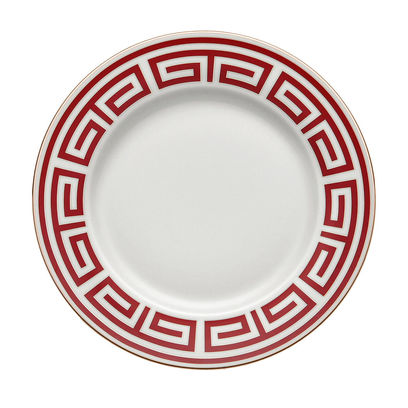 This stunning set of six dinner plates is elegant and modern, boasting a striking decoration designed by iconic master Gio Ponti in 1926. Part of the Labirinto collection, which means maze in Italian, the decoration features a geometric pattern in a superb scarlet-red hue that adds a refined touch to this piece, while also creating a timeless color combination with the white of the background and the gold details.